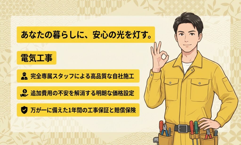 照明設置・修理サービスです。家庭やオフィスの照明環境を整え、快適で明るい空間を提供します。プロの技術で安全かつ美しい照明設置を実現。新規設置や交換、故障対応もお任せください。ご依頼の際には、信頼できる業者を選び事前に見積もりを取得し、サービス内容を確認することが重要です。