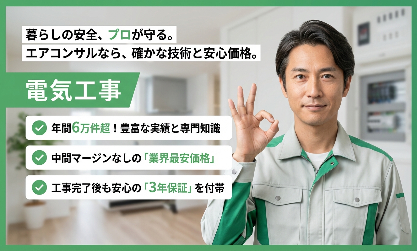 エアコンサルは、年間6万件を超える豊富な施工実績と、中間マージンをカットした明確な料金体系が最大の魅力です。経験豊富な電気工事士が365日体制で迅速な対応を可能にしており、さらに工事には3年保証が付くため、価格・スピード・安心のすべてが揃った信頼できる専門業者です。特に急な取り付け・取り外しをご希望の方におすすめです。