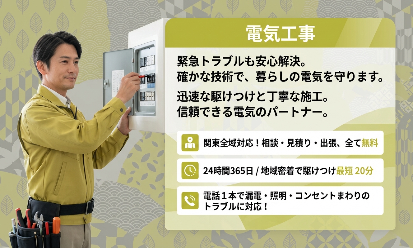 電話1本で漏電・照明・コンセントまわりのトラブルに対応!