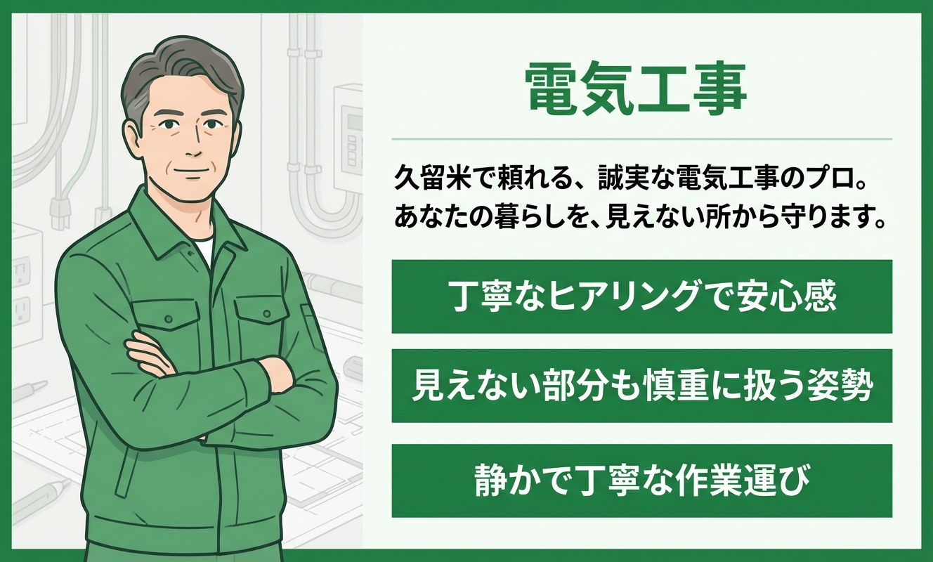 福岡県・佐賀県エリアに対応する久留米市 電気工事店は、24時間365日いつでも頼れる電気工事サービスを展開しています。エアコン設置や漏電対策、防犯設備の施工など、幅広い相談に即日対応しています。