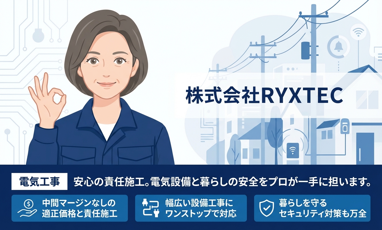 株式会社RYXTECは、創業17年以上の実績を持つ、住宅設備のスペシャリスト集団です。特筆すべきは、相談から施工、メンテナンスまでを一貫して自社で行う「100%自社施工」の体制です。マージンを排除した適正価格はもちろん、現場を熟知したプロが直接対応するため、細かな要望にも柔軟に応えてもらえます。防犯カメラやホームセキュリティの設置など、住まいの安全を守るパートナーとしても非常に頼りになる存在です。
