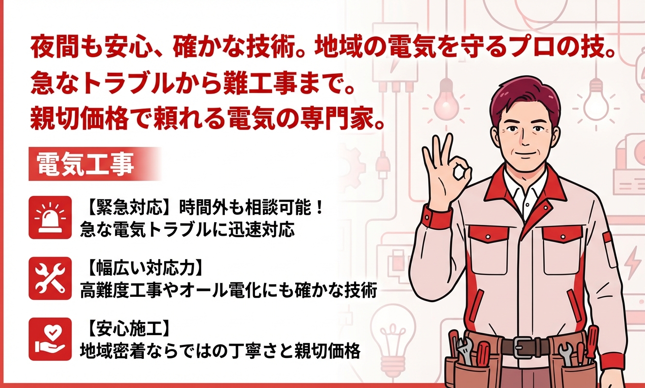 アペックス電気工事は、漏電や停電といった電気設備の緊急トラブルに対し、営業時間外でも相談可能な体制を整えている点が大きな魅力です。LAN配線や防犯カメラ、オール電化工事など、難易度の高い施工にも対応できる確かな技術力と、地域密着で培ってきた「丁寧さ」と「スピード」を兼ね備えています。安全性を重視し、お客様の幅広いニーズに親切価格で応える信頼できる専門業者です。