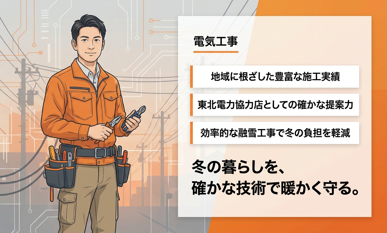 山照電工は、半世紀近い歴史を持つ老舗の電気工事業者です。単なる設備設置にとどまらず、家計や環境に配慮した「電化提案」を得意としており、光熱費の削減や利便性の向上に真摯に向き合っています。東北電力との連携も深く、アフターサポートまで含めた安心感は地域でも指折りです。住まいのエネルギー効率や雪対策にお悩みの方にとって、非常に頼りになる存在と言えるでしょう。