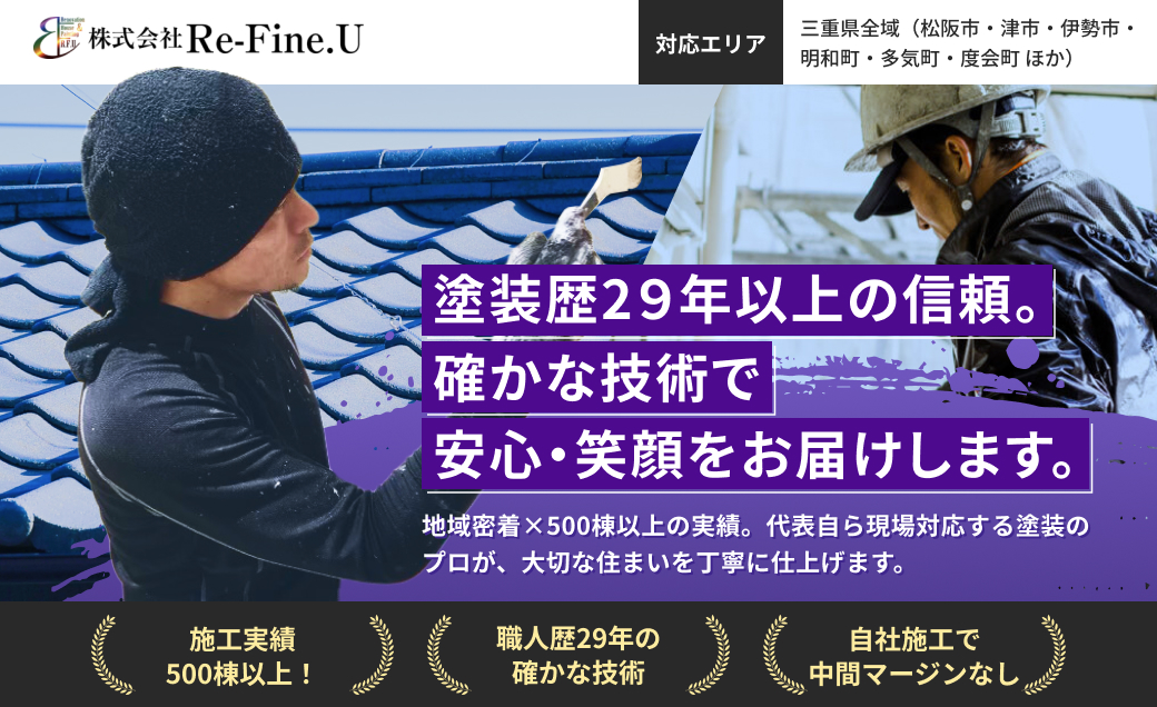 株式会社 Re‑Fine.Uは、職人歴29年以上の代表が現場に立ち、外壁・屋根塗装を中心に防水工事や足場設置まで一貫対応する地域密着の塗装専門店です。丁寧な現地調査と写真付き報告で建物の状態を分かりやすく説明し、ご希望に応じた最適なプランをご提案。施工実績は500棟以上にのぼり、豊富な経験と確かな技術力で多くのお客様から信頼を集めています。三重県全域に対応し、誠実な対応と高品質な仕上がりで、住まいの価値と安心をお届けしている塗装会社です。