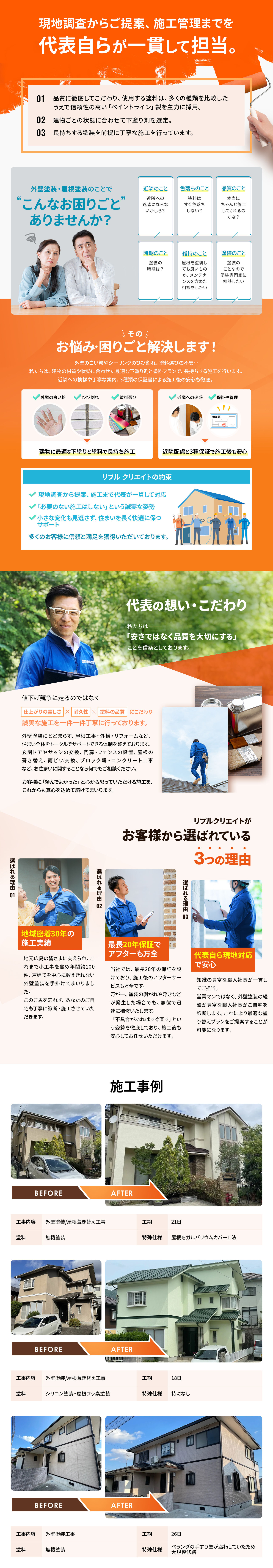 地域に根ざして30年以上。有限会社リプルクリエイトは、外壁塗装・屋根塗装を中心に、年間100件以上の施工を手がける地元密着の専門店です。