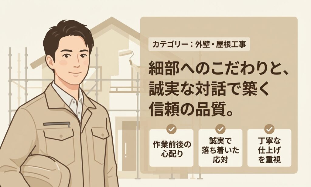 全体をベージュ系で塗り直したいと思っていましたが、色選びからとても丁寧に相談に乗っていただき、実際の仕上がりも想像以上に綺麗でした。 外壁だけでなく屋根まで統一感があり、家が一気に明るく見えるようになりました。 下地処理もしっかりしてくれている様子が伝わり、安心して任せることができました。大変満足しています!