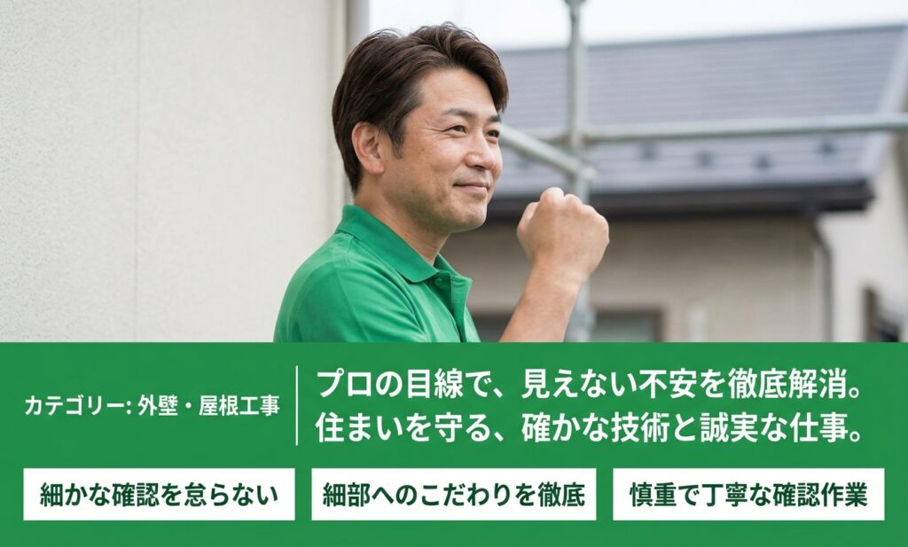 高圧洗浄 → クラック補修 → 下塗り → 中塗り → 上塗りの工程をしっかり踏み、色ムラやローラー跡が残らないよう、気温・湿度・乾燥時間を管理しながら進めました。