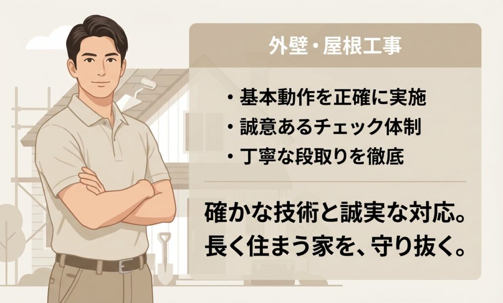 見積もりの段階で気になる部分を伝えると、代表さんが一緒に家の周りを回りながら「ここは補修しておいた方が安心です」と具体的に教えてくれました。塗装中も、塗り終えた箇所を確認する時間を取ってくれたので、色味やツヤをその都度チェックできて安心でした。