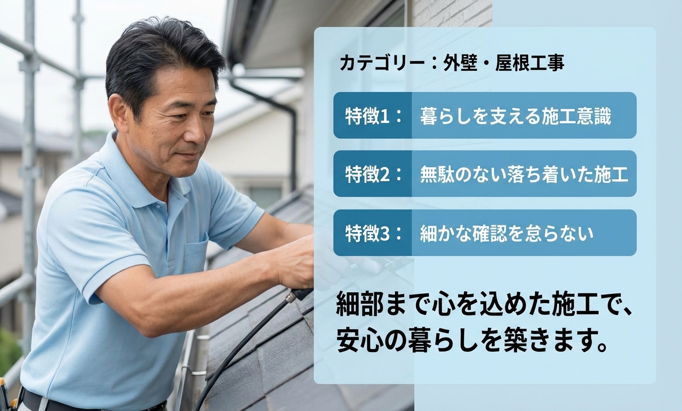 また、屋根修理や外構・エクステリア工事にも対応しており、住まいの外回り全般を幅広くサポートしています。塗装だけでなく、防水機能の強化や劣化部分の補修など、長く快適に住み続けるための工事も行われます。