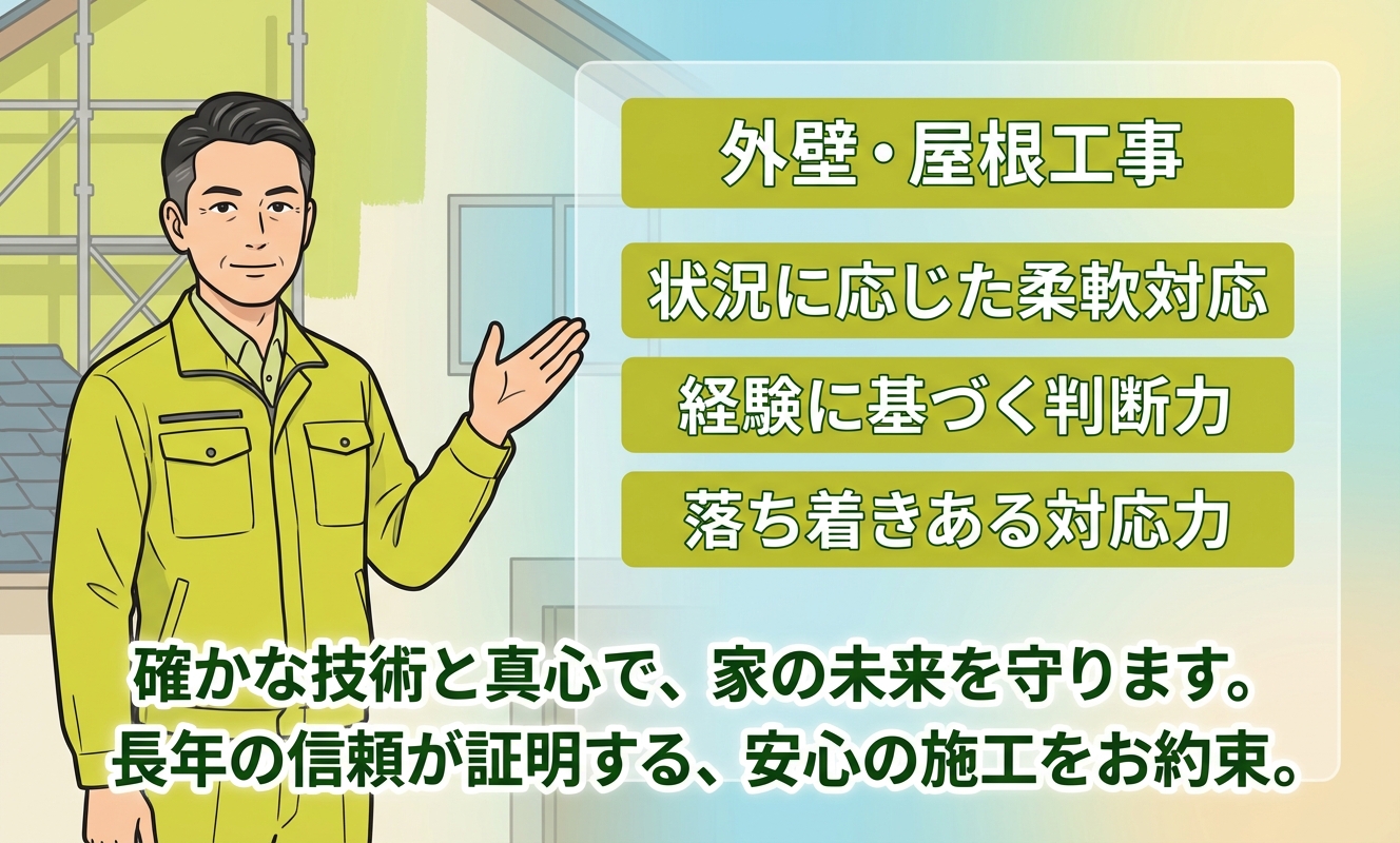 施工内容は外壁の塗り替えや屋根の塗装のほか、ひび割れ補修などの修繕工事、門まわりや塀の工事などにも対応。外観の印象を整えるだけでなく、機能性を保つサポートも行っています。