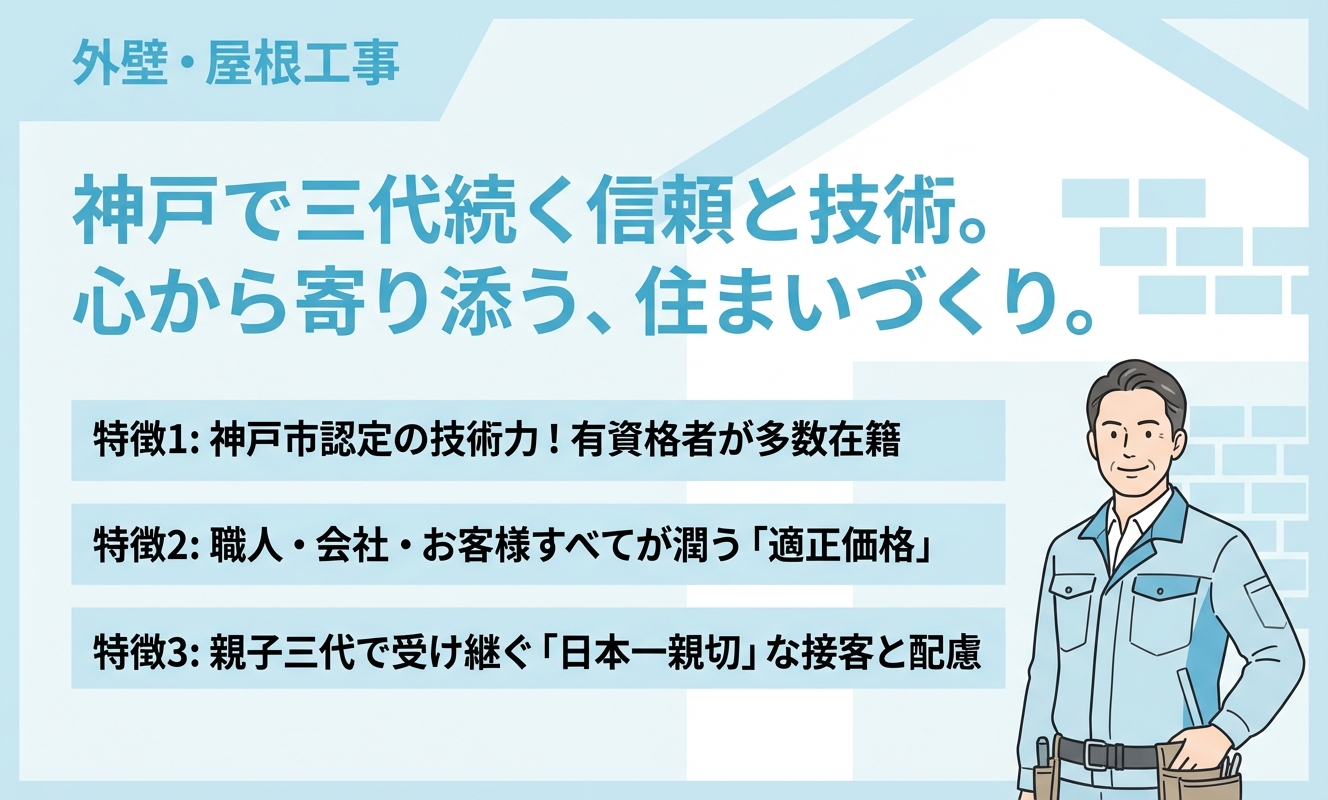 しらかわ工芸社は、「日本一親切な塗装専門店」を掲げ、お客様との長いお付き合いを大切にする塗装店です。神戸市優秀技能者認定の職人を含め、有資格者が多数在籍しており技術力は抜群。また、お客様の生活に配慮した施工体制と、すべてが潤う「適正価格」を追求する姿勢は、信頼できる業者選びの決め手となるでしょう。
