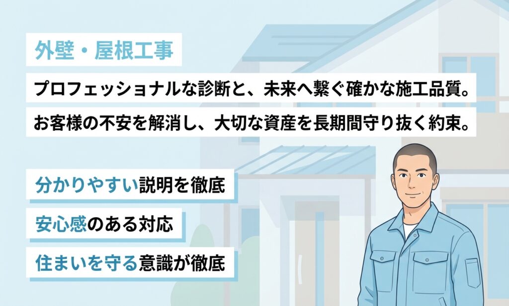 雨漏りが不安で防水工事を依頼しました。社長が直接現場を確認し、最適な施工方法を丁寧に説明してくれるため、工事内容に納得して進められました。仕上がりは継ぎ目のない美しい層が広がり、強度と安心感が大幅に向上。保証もしっかり付き、施工中の報告も丁寧でとても信頼できる会社です。