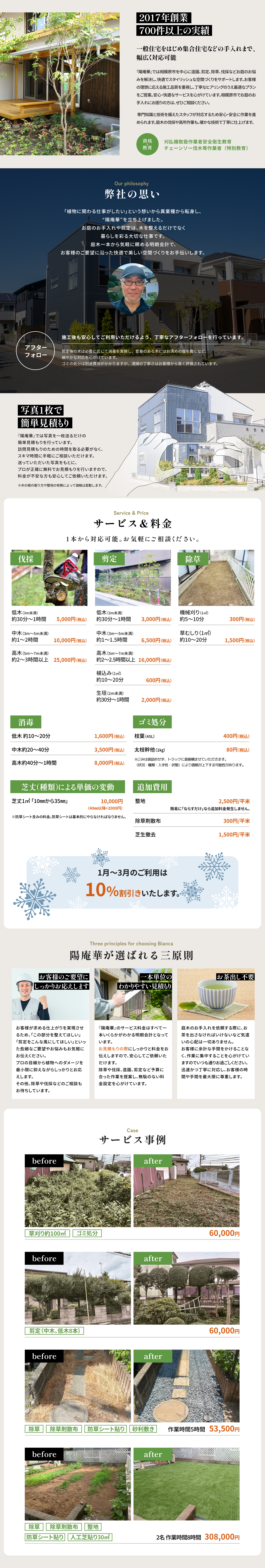 神奈川県相模原市を拠点とする「陽庵華(ビアンカ)」は、庭木の剪定・伐採・除草といったお庭のお手入れを一本から丁寧に対応する造園サービス事業者です。