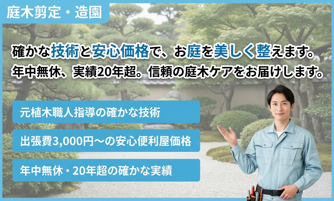 便利屋アルファ最大の魅力は、そのサービス範囲の広さにも関わらず、剪定・造園において専門性の高いサービスを提供している点です。元植木職人による指導と20年を超える実績は、仕上がりの美しさと信頼性を証明しています。出張費3,000円と価格も明確で、年中無休で急なお困りごとにも対応できる、地域の頼れる存在です。
