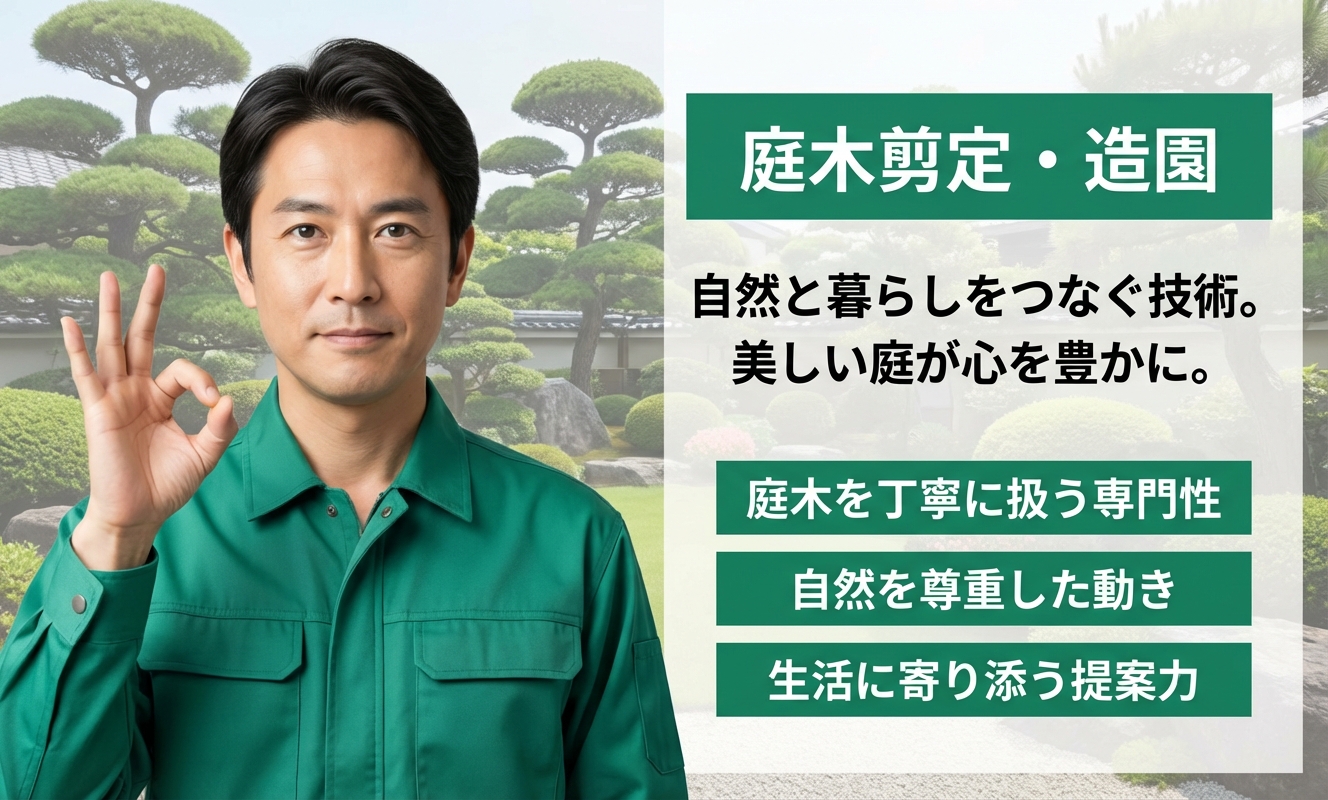 千葉市稲毛区を中心に若葉区、美浜区、中央区、四街道市で植木の剪定を中心に小さな造園工事をしている会社です。お客様視点の施工、質の高いサービスの提供、人にも植物にも思いやりを持った施工を心掛け、お客様のイメージを大切にするために事前ヒアリングに重点を置いて丁寧な作業をしてくれます。