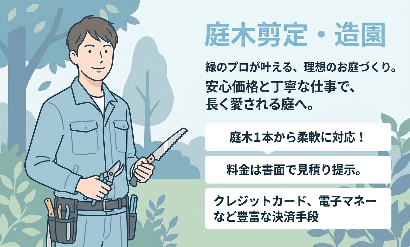 グリーンヒル岡の最大の魅力は、庭木1本から部分的な作業まで、お客様のニーズにきめ細かく対応してくれる柔軟性です。見積りは無料で、書面かつ有効期限付きで提示されるため、料金面での不安がありません。各種クレジットカードや電子マネーにも対応しており、利便性も抜群。千葉エリアで信頼できる造園業者をお探しの方におすすめです。