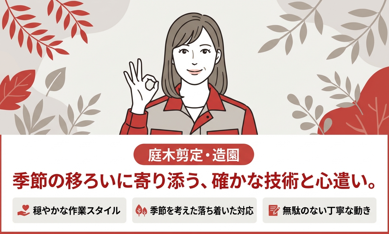 樹木の無駄な枝を取り除き、美しい成長を促したり、景観が悪くなった樹形を整えて風通しを良くして快適な庭造りをサポートしてくれます。虫の駆除、樹木の殺菌を適切な薬剤で防除、樹木にダメージを与えない様、樹種、剪定時期を考慮した対応をしてくれます。庭はもちろんのこと、耕作放棄地・遊休農地での草むしり、草刈り、場合によっては、除草剤散布、防草シート貼り、機械除草も行っています。