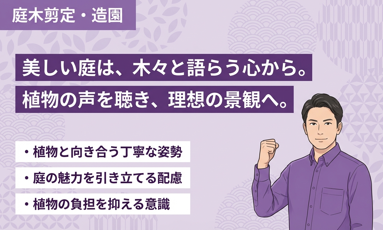 剪定等、植木(庭木)に関わる仕事は造園技能士1級等の資格をもった職人や経験を積んだベテランの職人が対応します。地域密着の造園業者として40年間培ってきた経験をを生かし、困った時に頼れる存在でありたいと思っています。