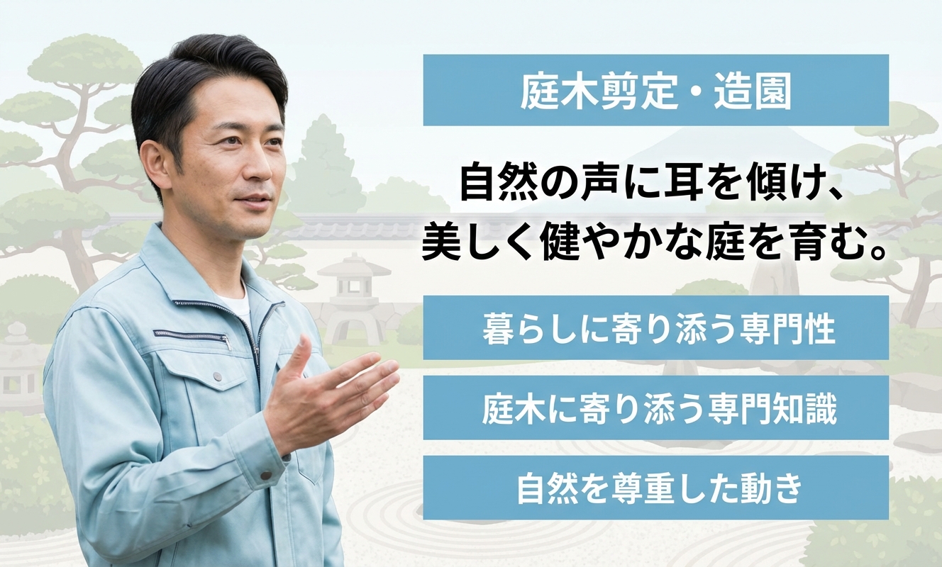 職人といえば「頑固で怖そう」、「ガラが悪そう」と思われがですが、長岡造園の職人は「親しみやすさと真面目さ」が自慢なので安心してご依頼いただけます。また「職人のこだわり=お客様の満足」とは考えておらず、何よりも「お客様の満足が第一」と考えて、常に柔軟な対応をしてくれます。豊富な知識と技術を活かし、お客様の意向にお応えするベテランの職人が揃っています。