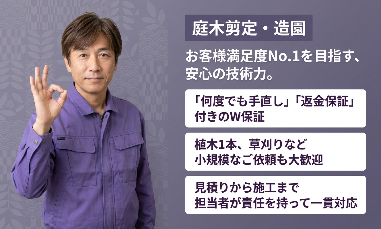 あなたの街の植木屋さんの最大の魅力は、顧客目線に立った安心体制の充実度です。見積りから施工まで担当者が一貫して対応することで高品質な作業を実現するほか、作業当日中に限り「何度でも手直しサポート」と「返金保証」を適用しています。これは業者選びに慎重な方も安心して相談できる大きな強みです。また、植木1本など小規模な依頼も快く引き受けてくれるフットワークの軽さも魅力的で、東京・神奈川エリアで頼れるパートナーとなるでしょう。