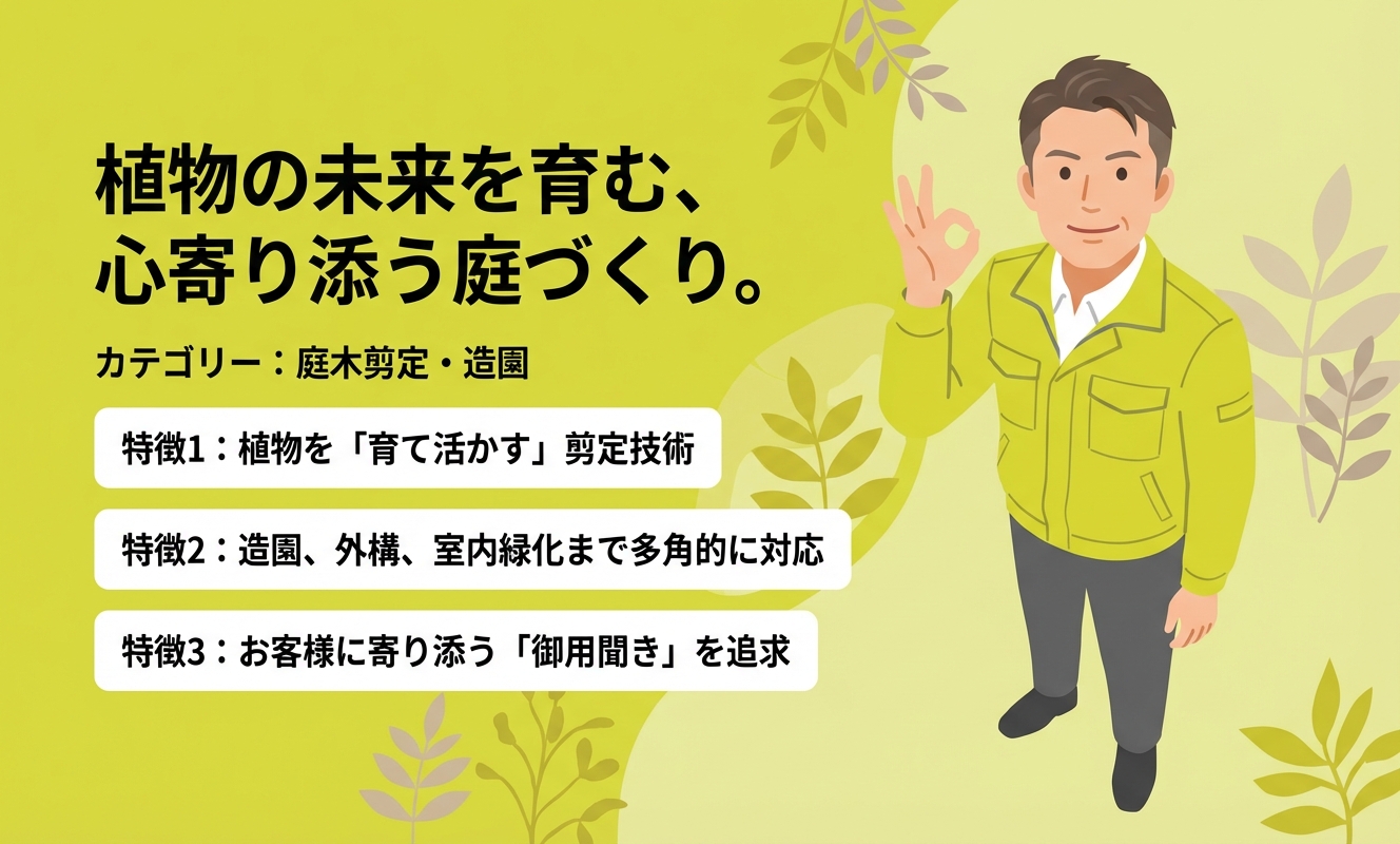 庭道楽の最大の特長は、お客様のあらゆる要望に応えようとする「御用聞き」としての姿勢です。単なる庭木の剪定業者ではなく、植栽を通して資産価値向上に貢献する提案力や、店舗・事務所を格上げする室内緑化など、多岐にわたるサービスを提供しています。植物を「育て活かす」剪定技術を持ち、庭を通じて暮らしに楽しみを提供してくれる、福岡で信頼できるパートナーです。