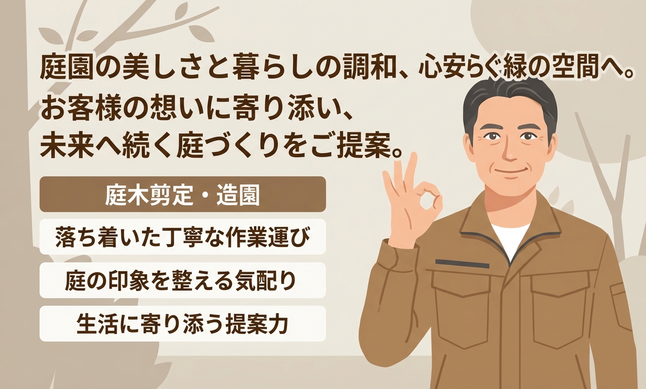 樹木の剪定・芝生・草取りなどのメンテナンスについて納得の低料金で作業してくれます。伸びた枝の剪定や雑草処理など、それぞれの状況に合わせたお手入れを行ってくれます。スポットでのご依頼はもちろんのこと、定期契約でも対応してくれます。個人様のお宅のメンテナンスはもちろんのこと、企業・公共施設・工業団地などでの植栽のお手入れにも対応しています。お庭以外のクリーニングや清掃作業にも幅広く対応しています。