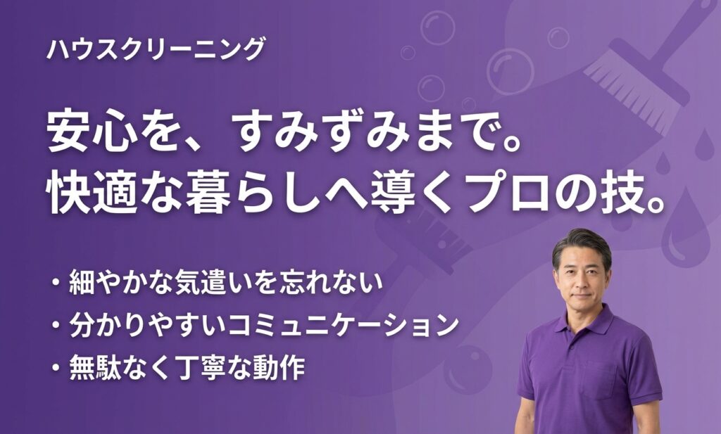 出産後、家事が回らなくなったので定期コースを始めました。女性スタッフのみなので、子どもがいても安心。特に助かったのは、作業中に子どもがぐずっても優しく対応してくださったこと。天然洗剤でのお掃除は小さな子にも優しいので、心配がなくありがたいです。毎回スタッフが同じなのも安心ポイント。埃の溜まりやすい場所や、うっかり忘れてしまう玄関まわりまで丁寧に手が入っていて、本当に助かっています。