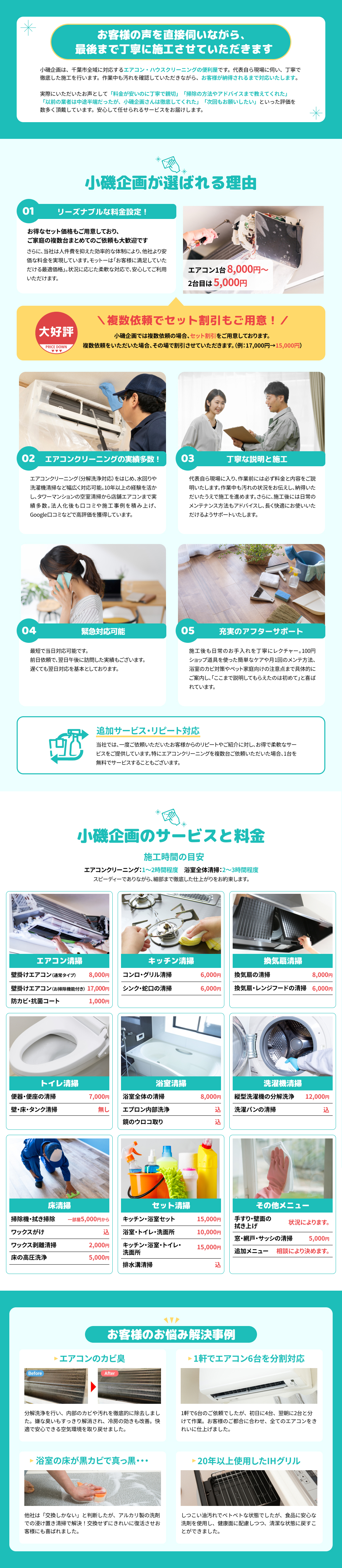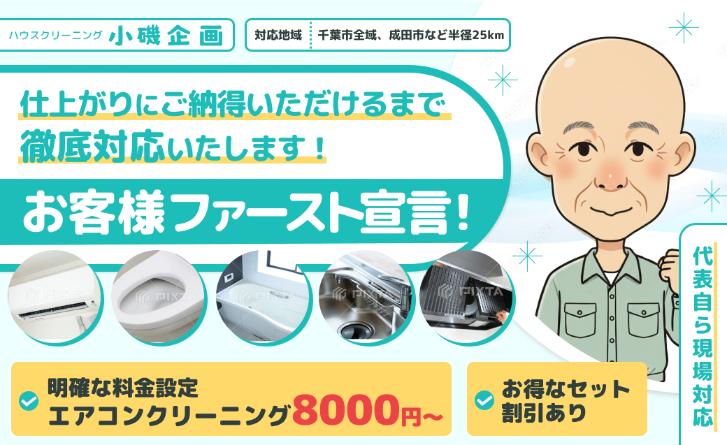 小磯企画は、ハウスクリーニングのお困りごとに対応し、「お客様ファースト」をモットーに千葉県全域への出張、早朝から夜間までの柔軟な予約制営業、クレジットカードやQRコード決済・交通系電子マネーなど多様な支払い方法を整え、親身で温かみのある対応力と迅速な駆けつけを強みに利用者から信頼を集めている頼れる業者です。