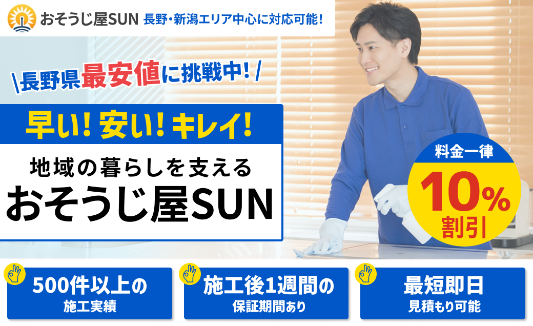 おそうじ屋SUNは、長野市を中心にハウスクリーニングと便利屋サービスを提供する、地域密着型です。