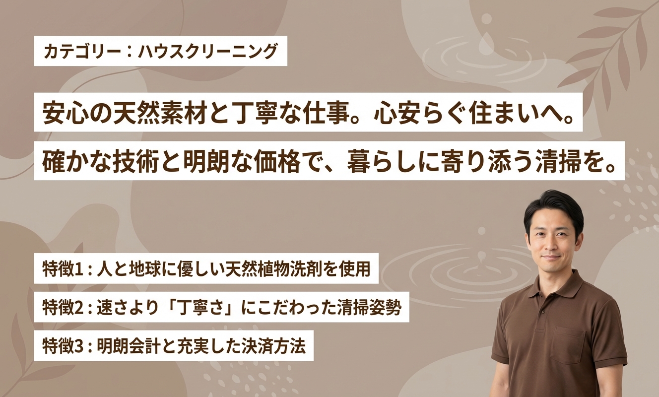 イワサハウスクリーニングサービスは、環境に配慮した天然植物洗剤を中心に使用している点が大きな特徴です。「人と地球に優しい」清掃を掲げ、ハウスクリーニング士資格取得者が在籍。料金は追加料金が発生しない明朗会計の定額制で安心感があります。また、「早いだけの適当な作業はしない」という姿勢で、時間をかけて隅々まで丁寧な清掃を徹底しており、品質を重視する方にとって信頼できる専門業者です。