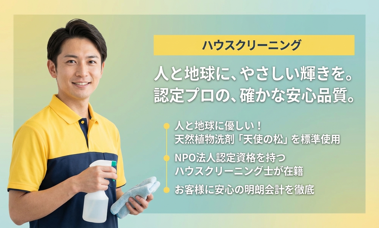 「おそうじシャイニー」は、NPO法人認定のハウスクリーニング士が在籍しており、技術力と利用のしやすさを両立しています。天然植物洗剤を標準で使用しているため、小さなお子様やアレルギーのある方がいるご家庭でも安全に利用できます。また、汚れの具合による追加料金が一切ない明朗な料金体系も、利用者が安心して依頼できる大きな魅力です。