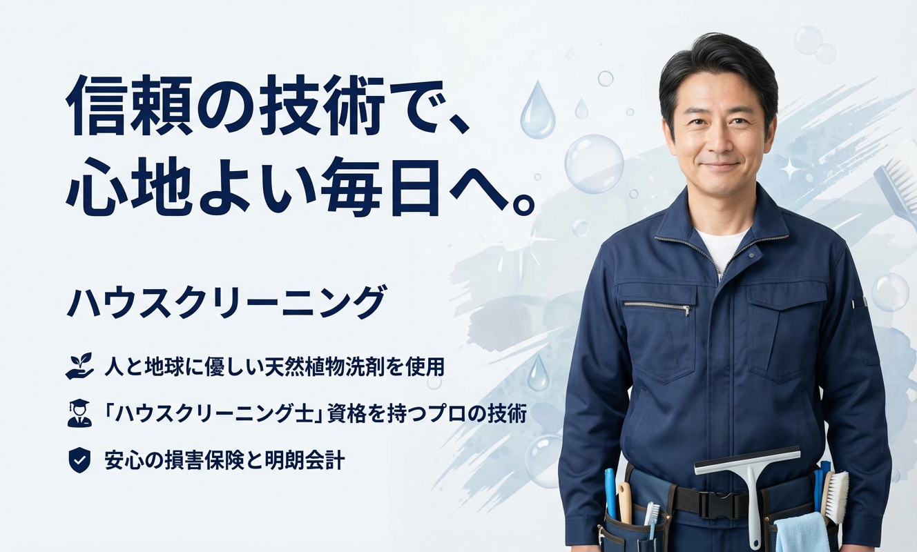 埼玉県越谷市を拠点に、周辺地域でハウスクリーニングとエアコンクリーニングサービスを提供している専門業者です。サービスの実施においては、人と地球に優しい天然植物洗剤を中心に使用している点が特徴です。また、「ハウスクリーニング士」の資格を持つスタッフが在籍しており、安心の損害保険と明朗会計のもとで作業を提供しています。