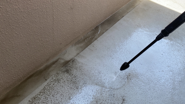砂やホコリなどでの汚れがめだちやすいベランダは、高圧洗浄機で一気に汚れを落とすのがオススメです。ただし、水が飛び散りやすいため、注意点を心得て周囲へ配慮しながら進める必要があります。