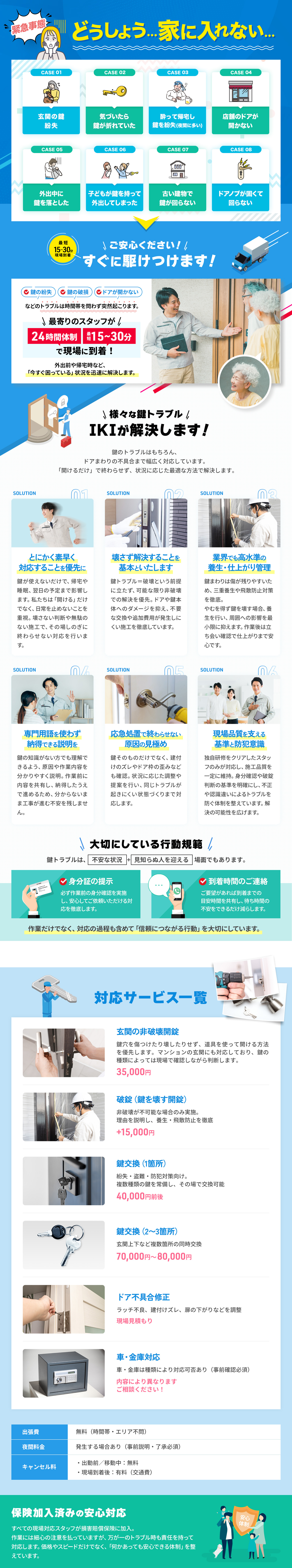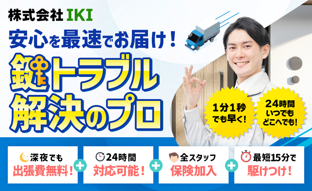 IKIさんの最大の強みは、最短15〜30分で駆けつける圧倒的なスピード感です。関東・大阪・宮城エリアに30名のスタッフを配置し、位置情報共有システムによって「今、最も近くにいるプロ」を即座に派遣できる体制を整えています。
