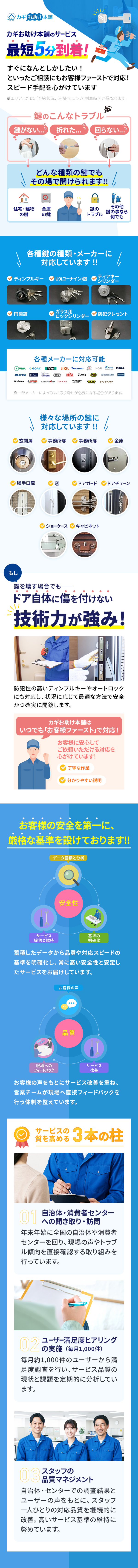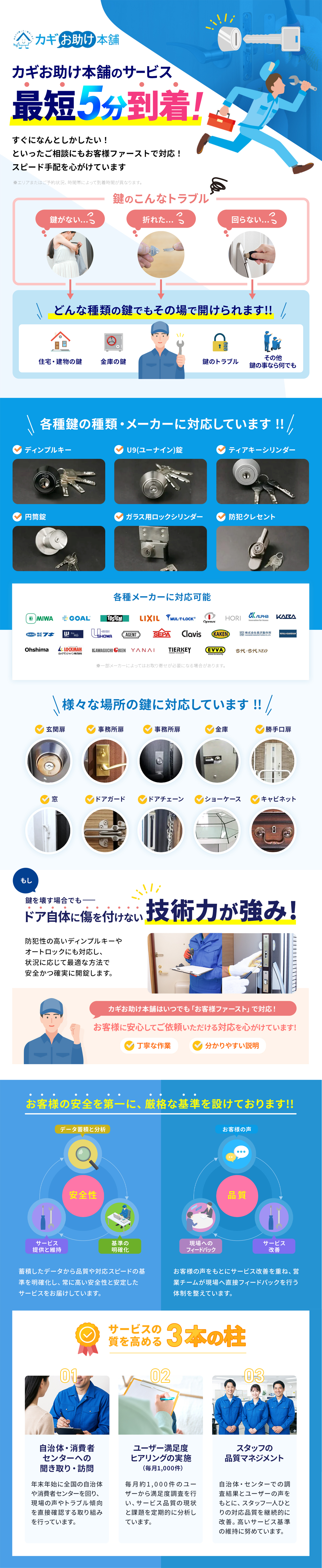 私どもカギお助け本舗は、「どこに頼めばよいかわからない」「悪徳業者ではないか心配」というお声に真摯に向き合い、全国どこでも1分1秒でも早くお客様の不安を解消することを使命としております。