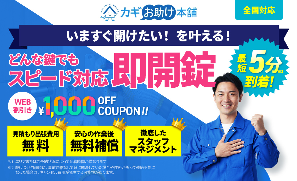 カギお助け本舗は、日本全国対応していて、自宅の玄関や店舗、車、バイク、金庫など、あらゆる鍵の開錠・交換・修理に対応しています。どのメーカーのどんなタイプの鍵でも対応が可能です。最短5分で到着も可能で、緊急性の高い鍵トラブルでも安心です。当日成約で割引も利用できるため、お急ぎの方はぜひご利用ください。