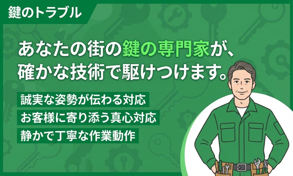 問い合わせたところ、対応可能とのことで依頼。開錠に少し時間はかかりましたが、破壊せず丁寧に対応してくれました。