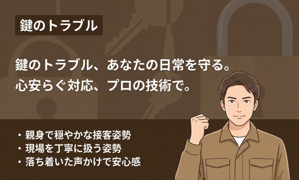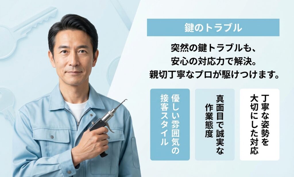 依頼後すぐに来てくれて、慎重に作業を進めてくれました。壊すことなく開けてくれたのは技術力の高さを感じました。費用も無理のない範囲で収まり、丁寧な説明も好印象でした。