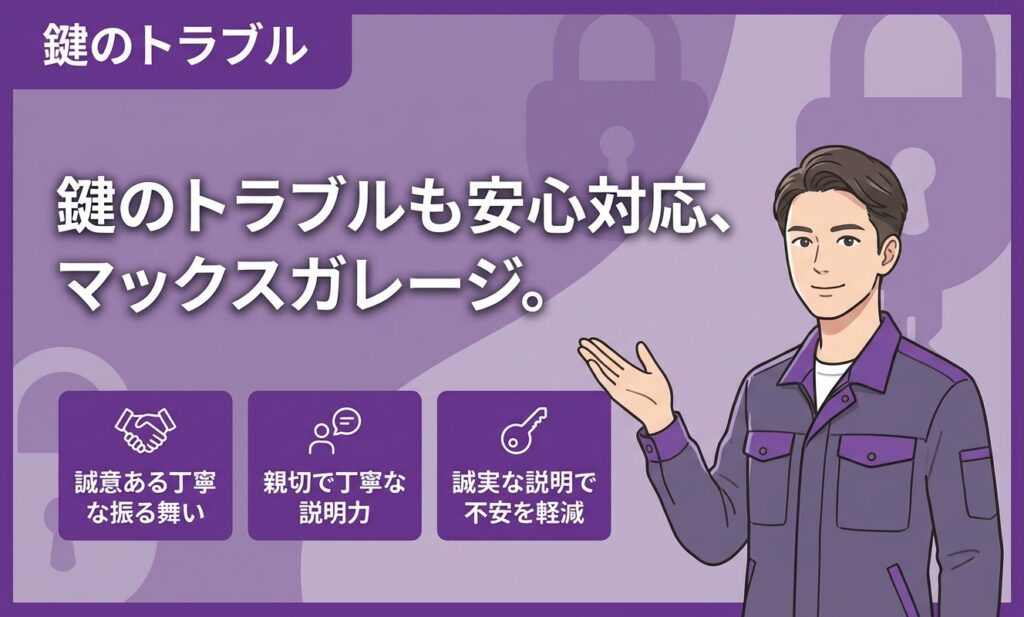 問い合わせたところ、対応可能とのことで依頼。開錠に少し時間はかかりましたが、破壊せず丁寧に対応してくれました。