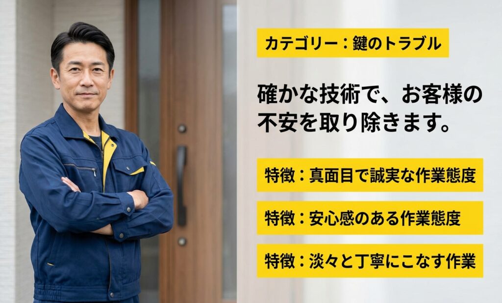 依頼後すぐに来てくれて、慎重に作業を進めてくれました。壊すことなく開けてくれたのは技術力の高さを感じました。費用も無理のない範囲で収まり、丁寧な説明も好印象でした。
