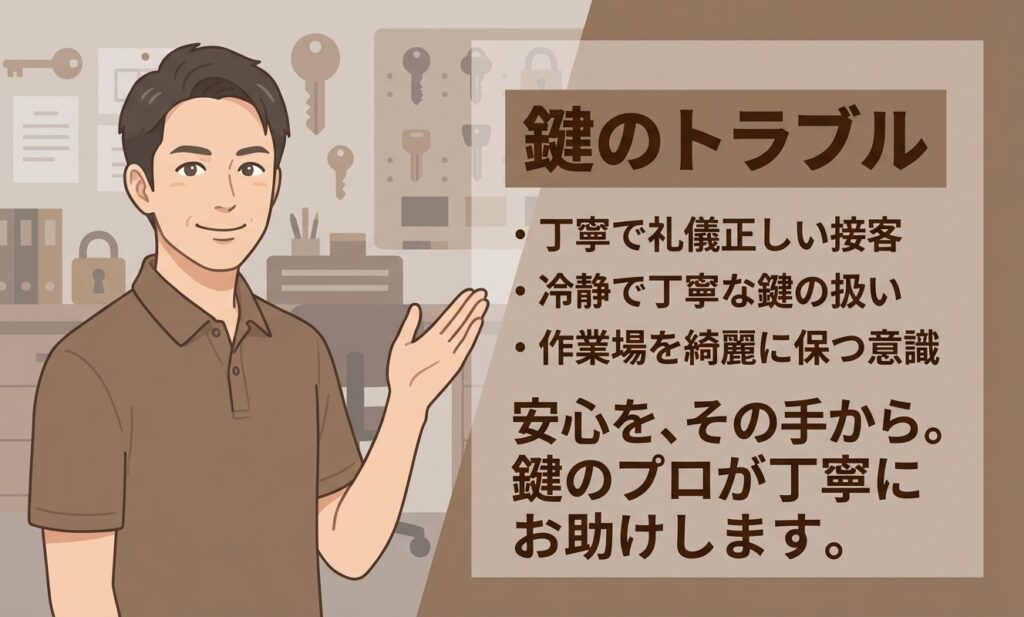 問い合わせたところ、対応可能とのことで依頼。開錠に少し時間はかかりましたが、破壊せず丁寧に対応してくれました。