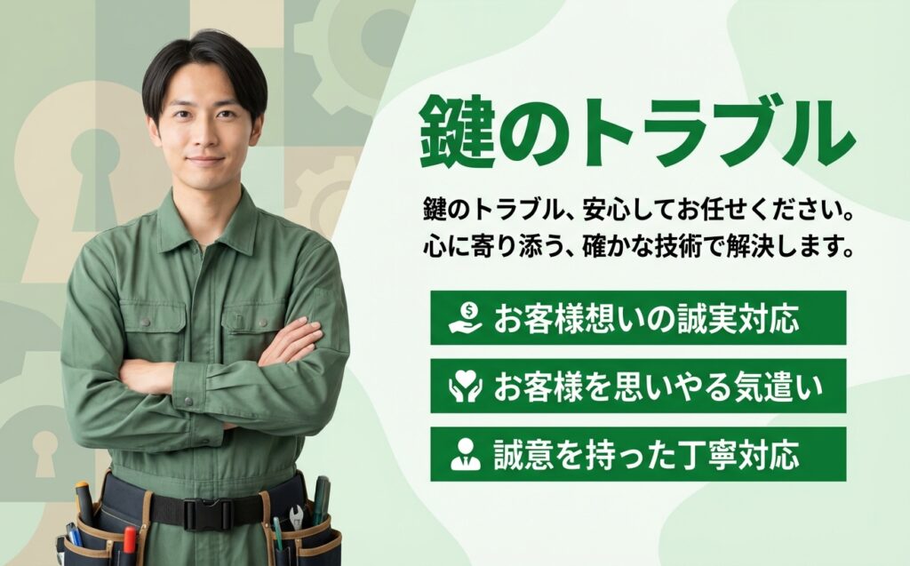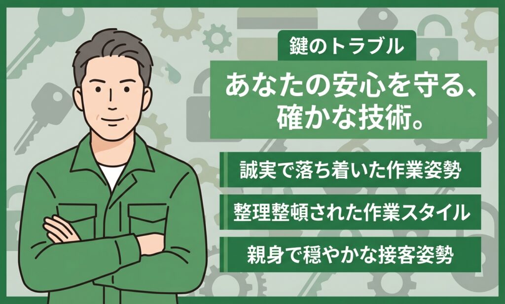 問い合わせたところ、対応可能とのことで依頼。開錠に少し時間はかかりましたが、破壊せず丁寧に対応してくれました。