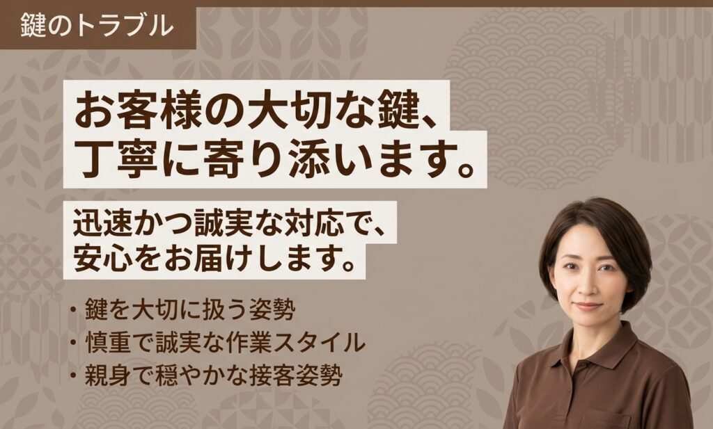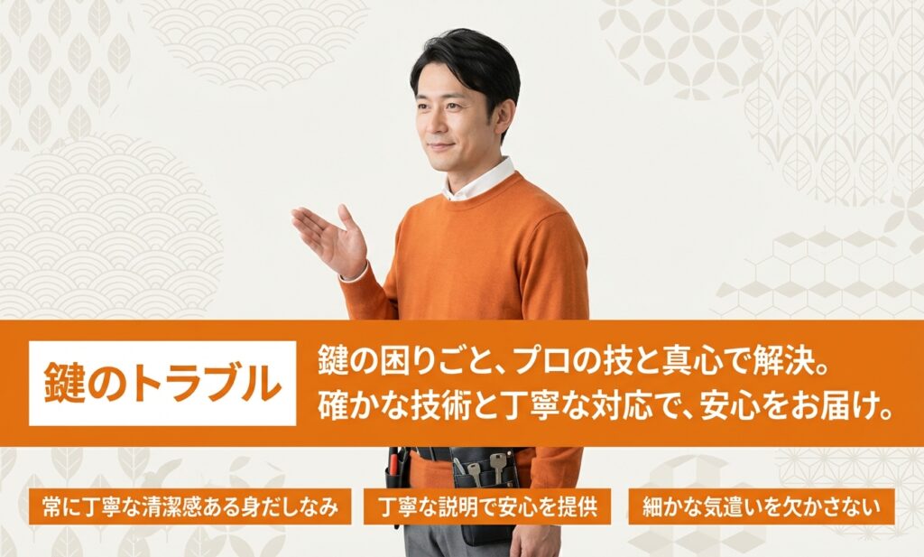 問い合わせたところ、対応可能とのことで依頼。開錠に少し時間はかかりましたが、破壊せず丁寧に対応してくれました。