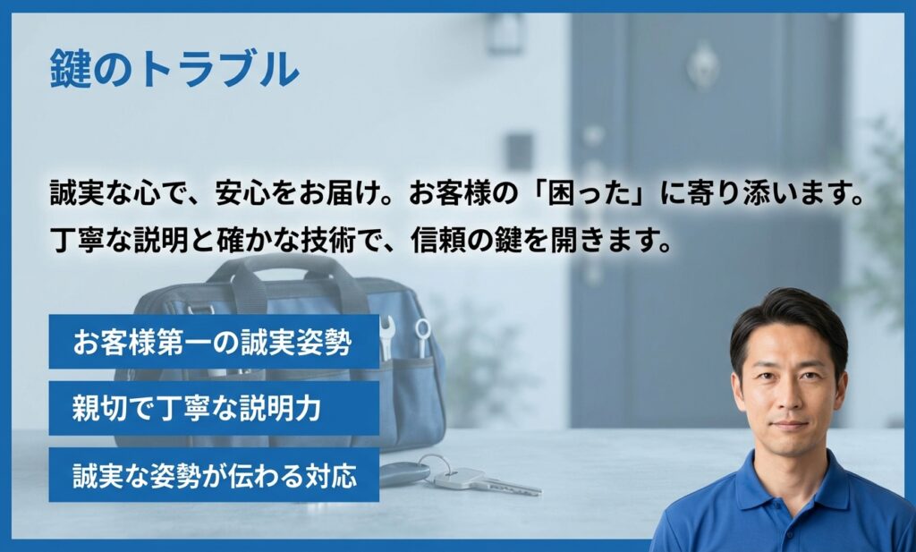交換部品の種類もいくつか紹介してくれて、防犯面も考慮して選べました。料金も想定より安く、現場対応も丁寧でした。