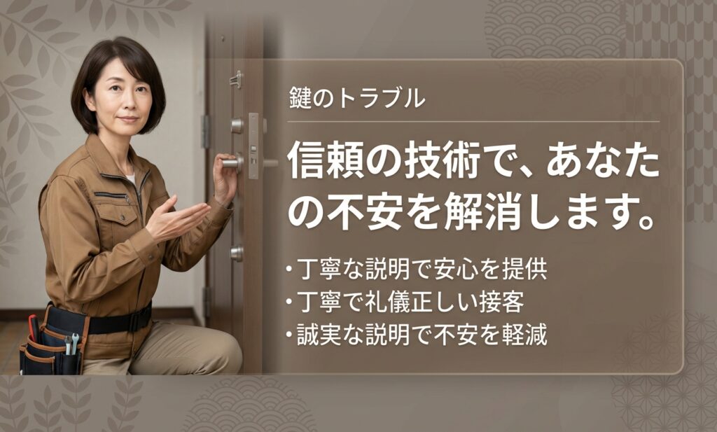 交換部品の種類もいくつか紹介してくれて、防犯面も考慮して選べました。料金も想定より安く、現場対応も丁寧でした。