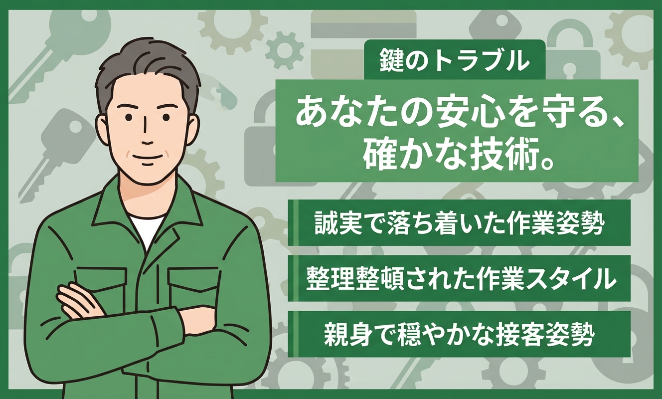 アーネストロックさんは地域密着型ということで、電話対応から現地到着までが非常に早く、土地勘もある様子で安心感がありました。