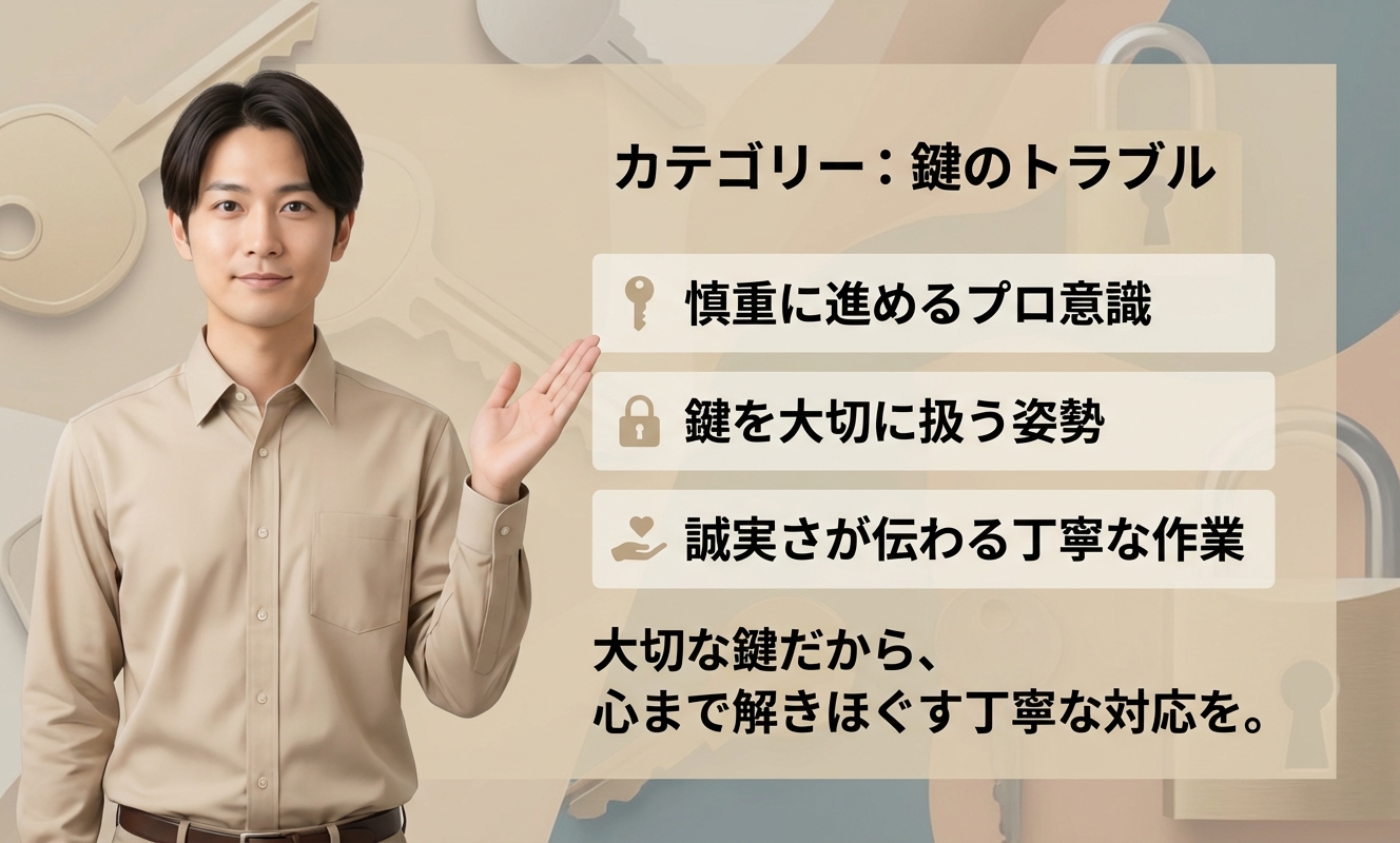 作業前に料金や作業内容について分かりやすく説明してくれたので、不安なくお願いできました。無事に開錠後も動作確認まで丁寧に対応してくれました。