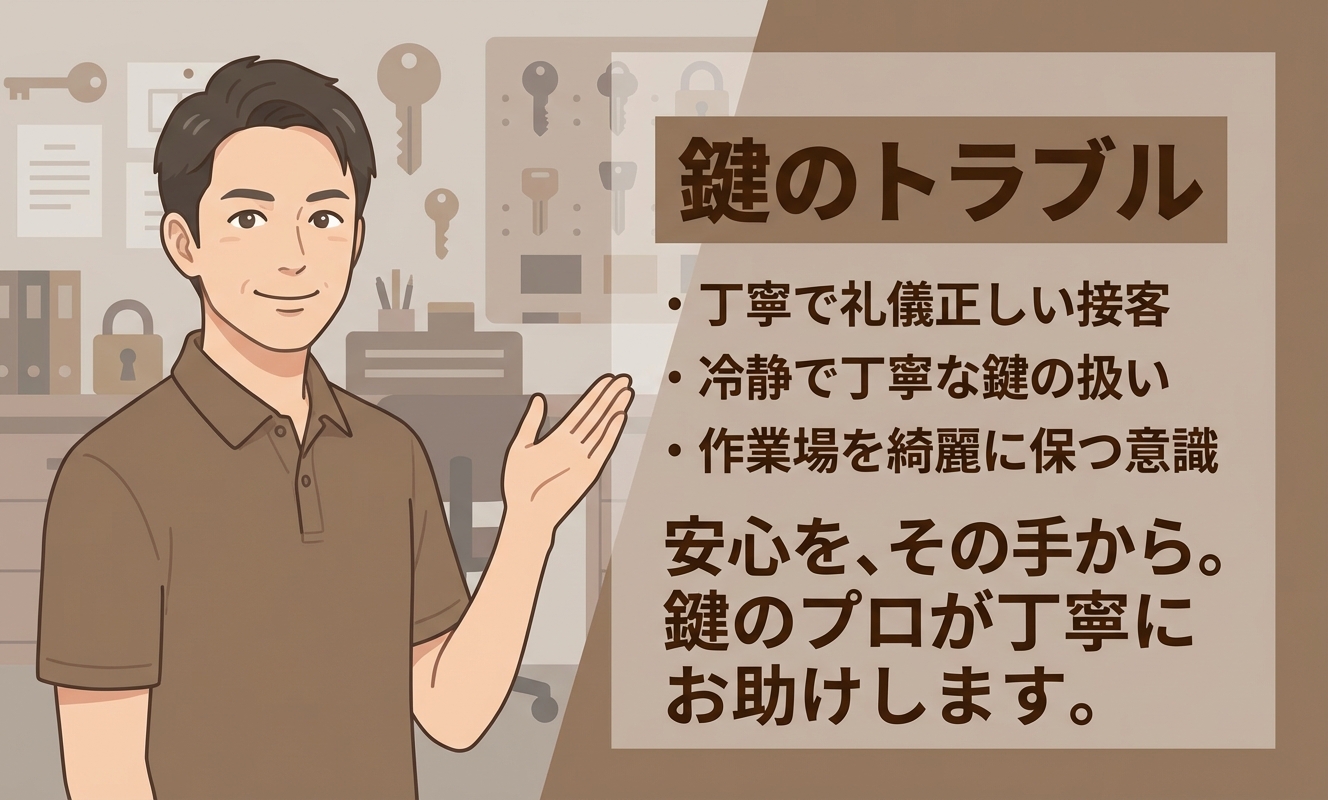 拠点が近くにあったようで、30分ほどで作業員の方が到着して、あっという間に解錠してくれました。丁寧迅速な対応に感謝しています。