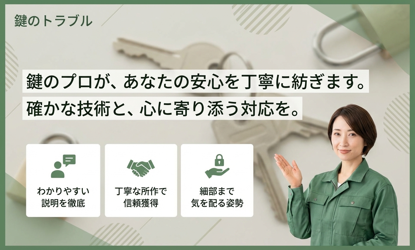 電話でもしっかりと要望を聞いてくれて、訪問当日もいくつかの鍵を提案してくれたのがありがたかったです。予算や防犯性能の違いまでわかりやすく説明してもらい納得して選べました。