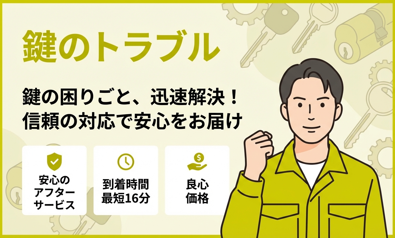 カギ本舗は、神戸市を含む全国対応の鍵修理・交換業者です。24時間年中無休で受付し、高い技術力を持つスタッフが最短16分で現場に急行。玄関から車・金庫まで幅広い鍵トラブルに対応し、施工後は1年間保証でアフターフォローも万全です。